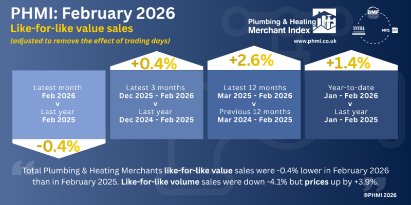 The latest figures from the Plumbing & Heating Merchant Index (PHMI) report show like-for-like value sales (adjusted to remove the impact of trading days) for February 2026 through specialist plumbing and heating merchants were -0.4% lower than the same month in 2025. Like-for-like volume sales were down -4.1%, but prices increased +3.9%. There was no difference in trading days.
